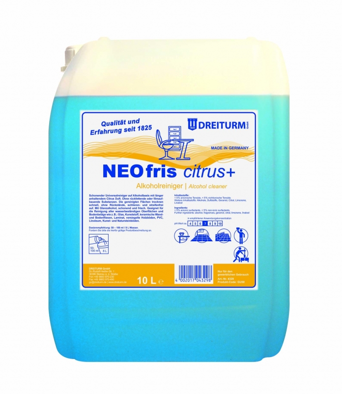 Dupa gradul de murdarie, se aduga 50 - 100 ml NEOfris citrus +, in 8 litri apa. O clatire ulterioara nu este necesara. Suprafetele lucioase nu devin mate, pentru ca produsul nu contine substante daunatoare. NEOfris citrus + nu se adauga in apa calda, deoarece contine alcool care prin evaporare afecteaza procesul de curatenie. NEOfris citrus + este codat in culoarea albastra, pentru a evita folosirea acestuia in alte scopuri.